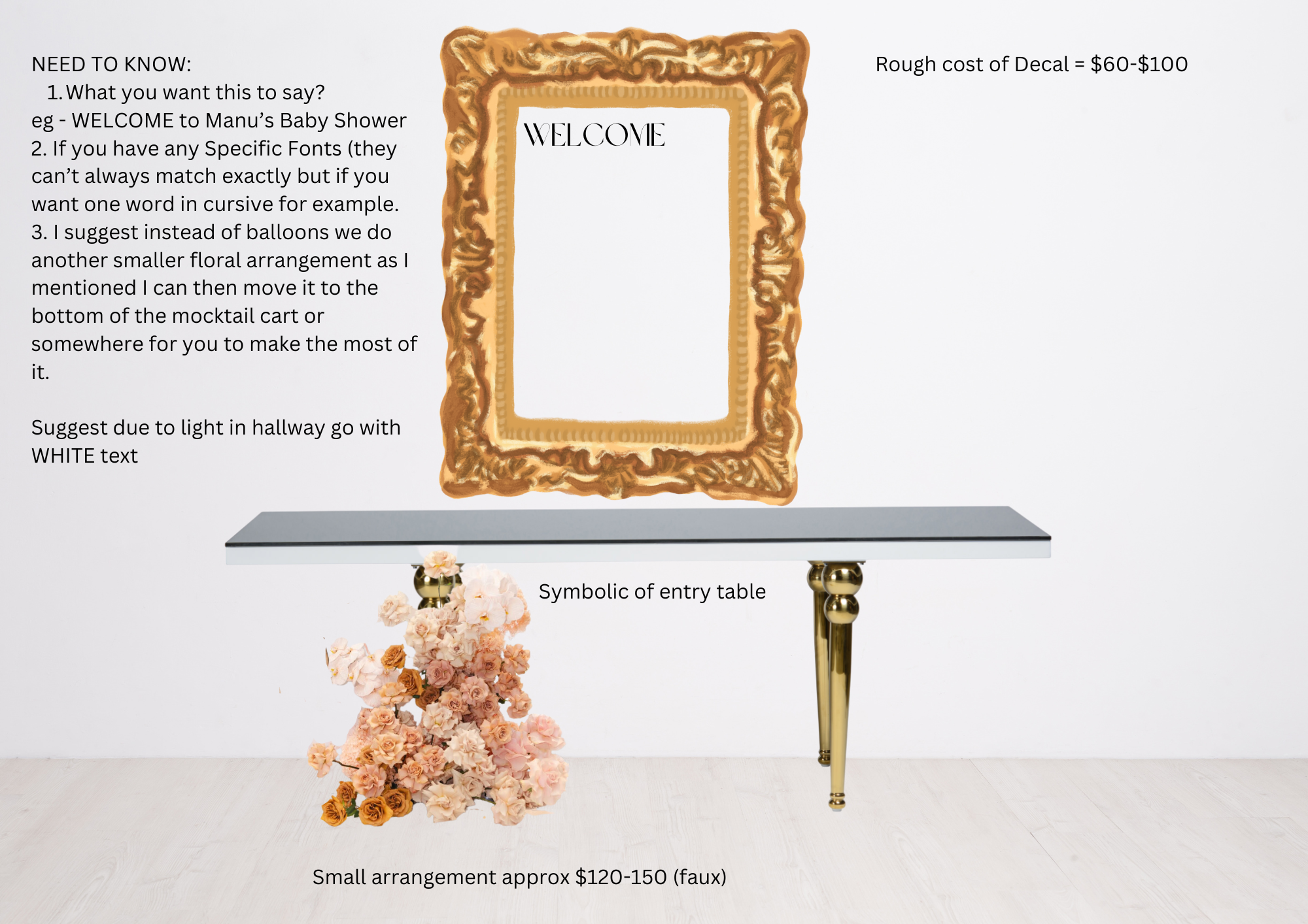 There was a small hiccup on the day where the decal on the backdrop was too high and hidden by the floral arrangement so having to pivot and recentre the florals to ensure the backdrop was still giving the elegance the client wanted and re positioning the planned florals elsewhere.